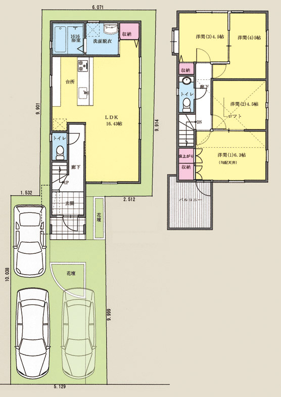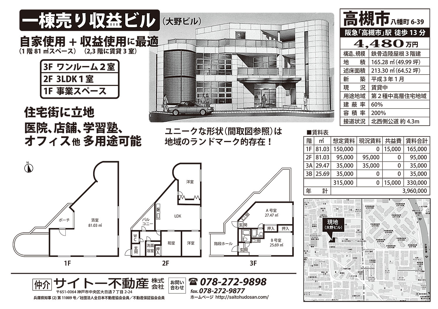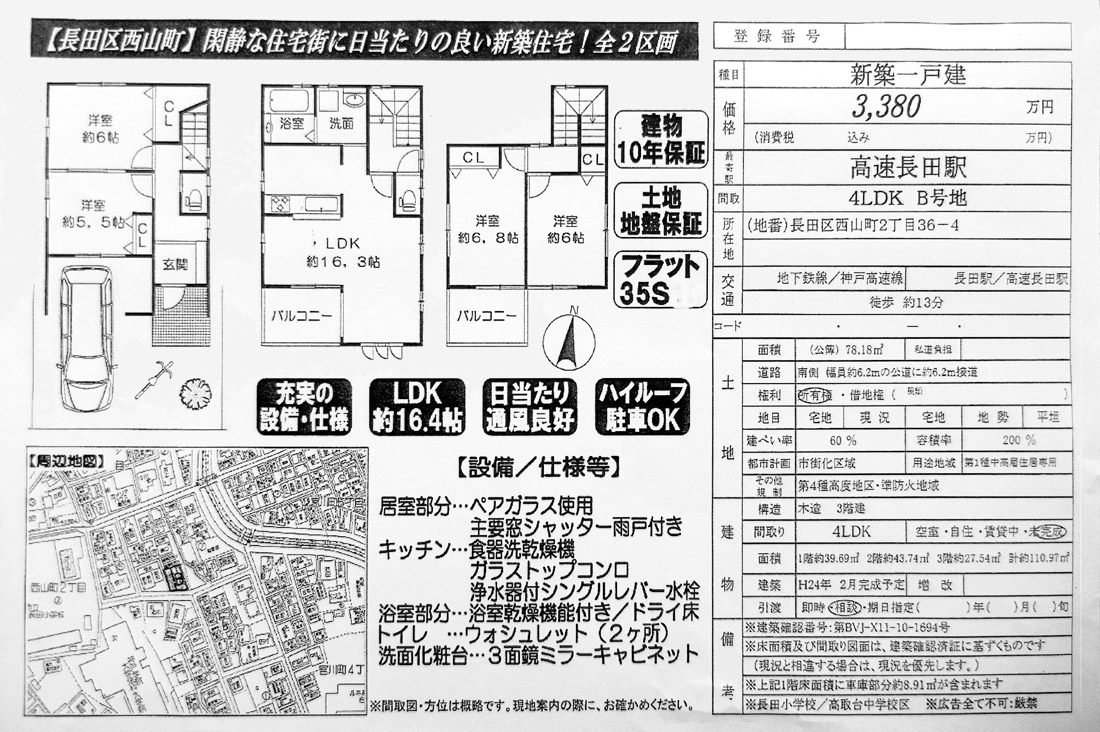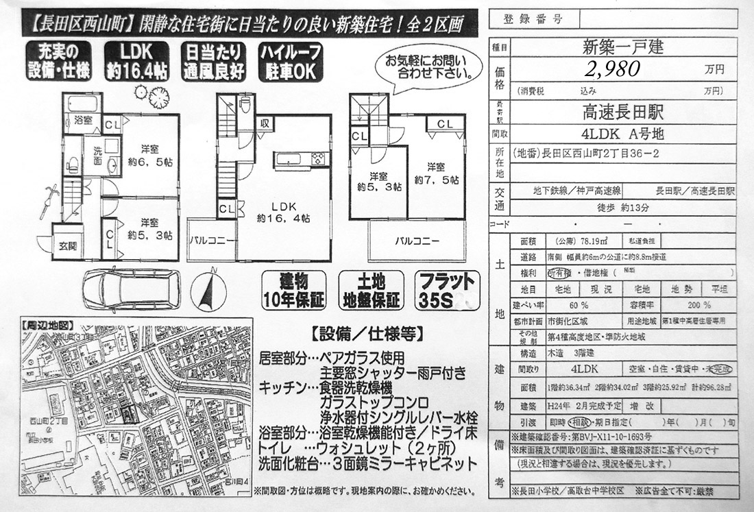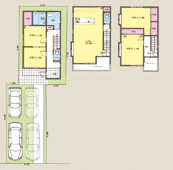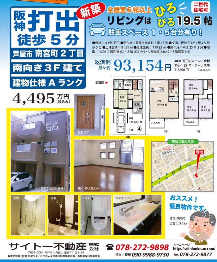 ■詳細資料 南向き3F建て、駐車スペース1.5台分有り、リビングは広々19.5帖、建物仕様Aランク |