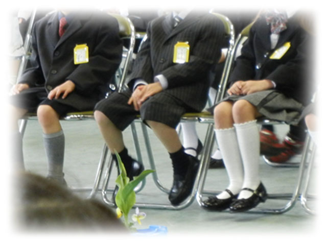 どの1年生も初々しいのですが、なんといってもかわいいのが小学校1年生。ちょっとドキドキの面持ちでパイプ椅子に座って、床に届かない足をぷらぷらさせている姿は微笑ましいものです。