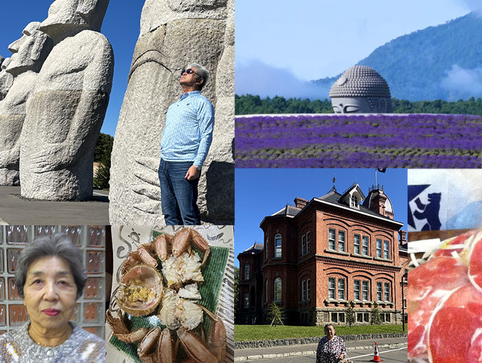 (写真=霊園のモアイ像と頭大仏、北海道庁、北海道のグルメ、母の写真) |